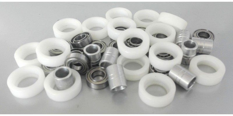 Kit of 16 stainless steel micro 688 bearings + 16 acetal resin adapters + 8 aluminum spacers.